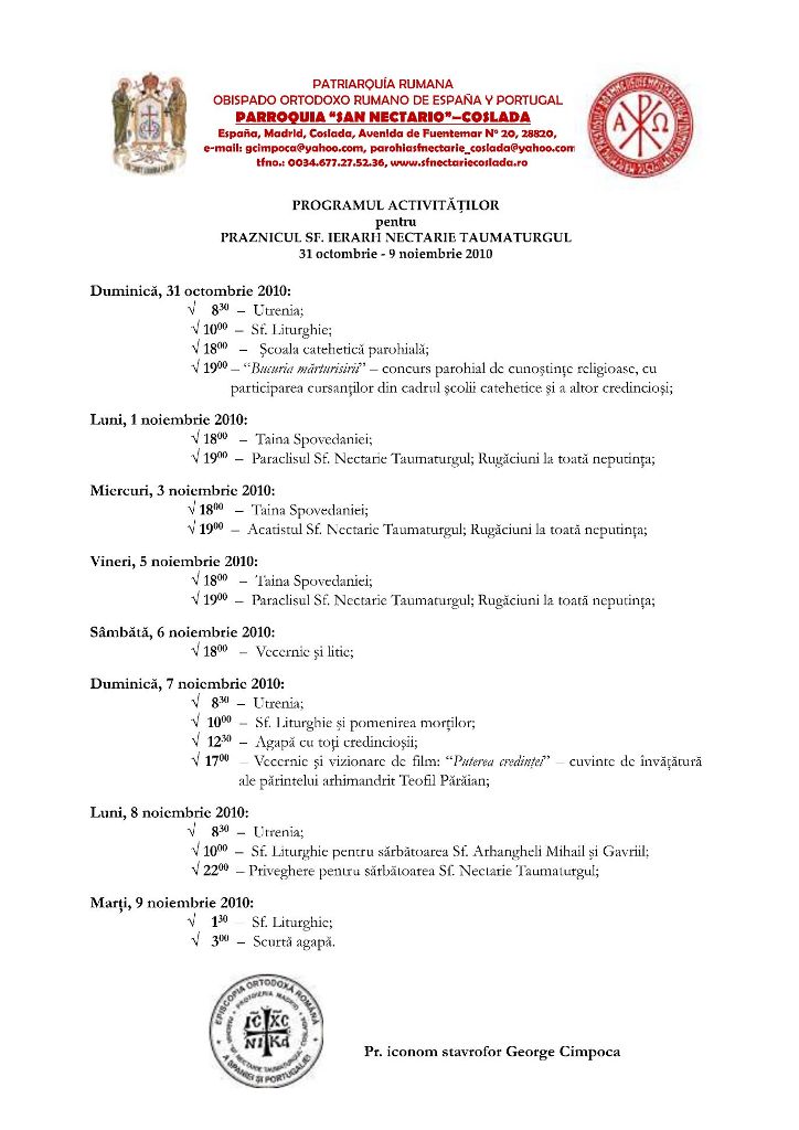 1 noiembrie 2010 Programul activităţilor pentru hramul parohiei admin_nec Anunțuri, Parohie, Program, Sfântul Nectarie