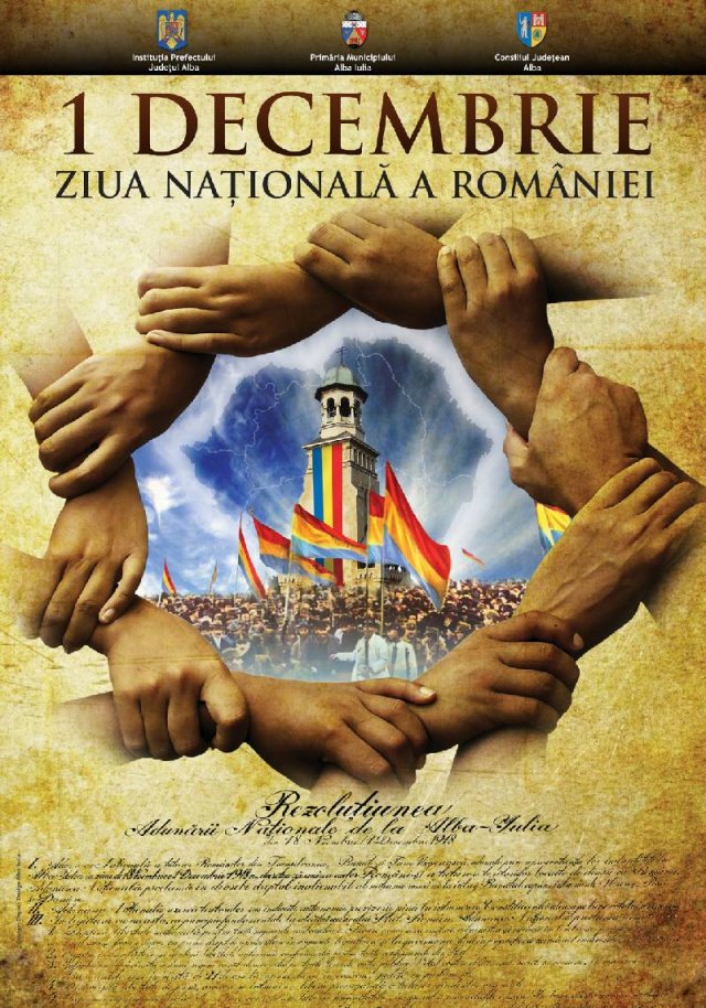 1_decembrie_1918Ziua Naţională a României este, trebuie să fie, un prilej de marcare a demnităţii noastre comune, în context european şi mondial. Unitatea politică românească, înfăptuită la 1 Decembrie 1918, vine din trecut, dar ne trimite, cu multă generozitate, spre viitor. Atunci, adică acum aproape un secol, în anul de graţie 1918, s-au reunit toate energiile vitale ale poporului român spre a forma Regatul României întregite. Deciziile luate de naţiunea română, prin reprezentanţii săi cei mai autorizaţi, aleşi în chip democratic şi reuniţi la Chişinău, Cernăuţi şi Alba Iulia, au marcat pentru vecie destinul poporului nostru. România nu s-a întregit atunci, ci, de fapt, s-a regăsit între frontierele sale fireşti, reunindu-i sub ocrotirea aceluiaşi stat, pentru prima oară în istorie, pe majoritatea românilor. Cel mai mare entuziasm naţional s-a manifestat în Transilvania, unde 1.228 de delegaţi cu drept oficial de reprezentare şi de vot, în numele a mii de localităţi, al Bisericii, al partidelor, organizaţiilor profesionale, al asociaţiilor, al şcolilor etc., în mijlocul a peste 100.000 de oameni strânşi în ordine desăvârşită pe locurile unde Mihai Viteazul reunea pentru prima oară cele trei Ţări Române, îşi exprimau decizia nestrămutată de unire a Transilvaniei şi a celorlalte regiuni istorice româneşti cu România.