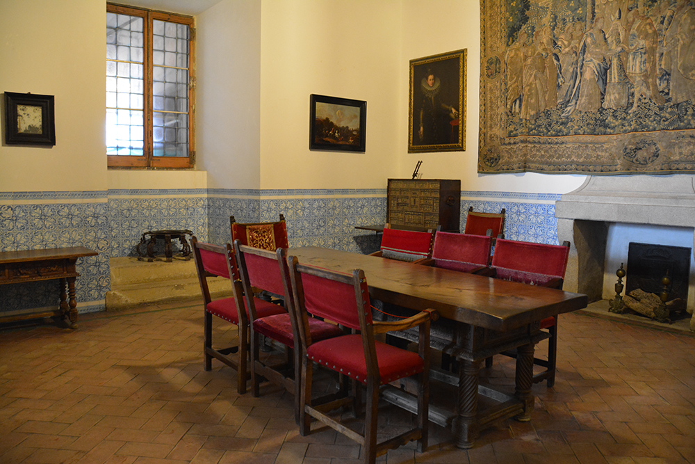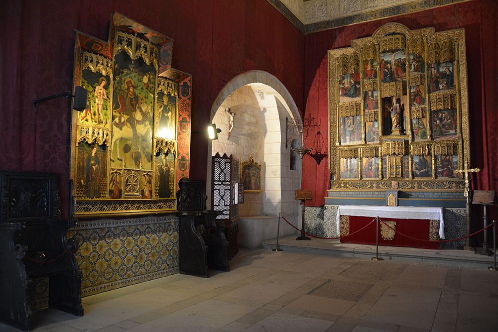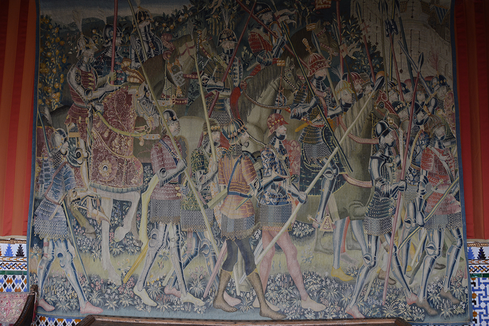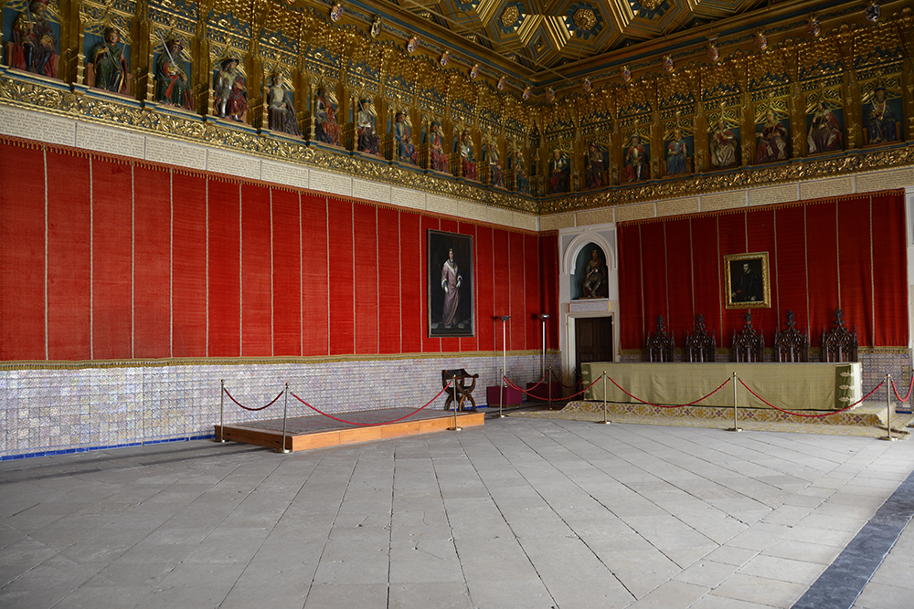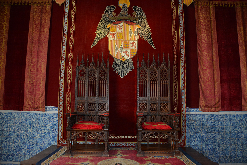 Pașii te poartă prin camerele castelului vechi cu armuri din secolul al XV-lea, treci apoi prin camera șemineului, cu mobilier și tapiserii flamande din secolul al XVI-lea, de unde printr-o ușă cu decorațiuni în stil Mudejar ajungi în Sala Tronului. Tronul aflat sub o copertină de catifea poartă armele monarhilor catolici, iar pereții sunt acoperiți cu brocart și catifea. Vei trece apoi prin galerie ca să ajungi în camera conurilor de brad.