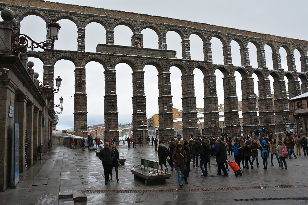 Apeductul din Segovia este unul din monumentele cele mai importante păstrate din perioada romană pe peninsula iberică. Construit probabil în sec. I-II d.Hr., apeductul aducea apa izvorului Fuenfria în oraș. Înălţimea maximă la care ajunge este de 28 de metri. Este compus din 167 de arce. Marile pietre de granit din care este construit sunt așezate fără niciun fel de material care să servească de unire a pieselor.